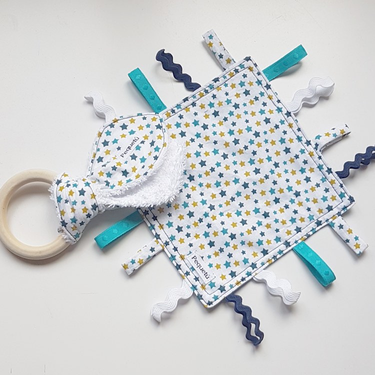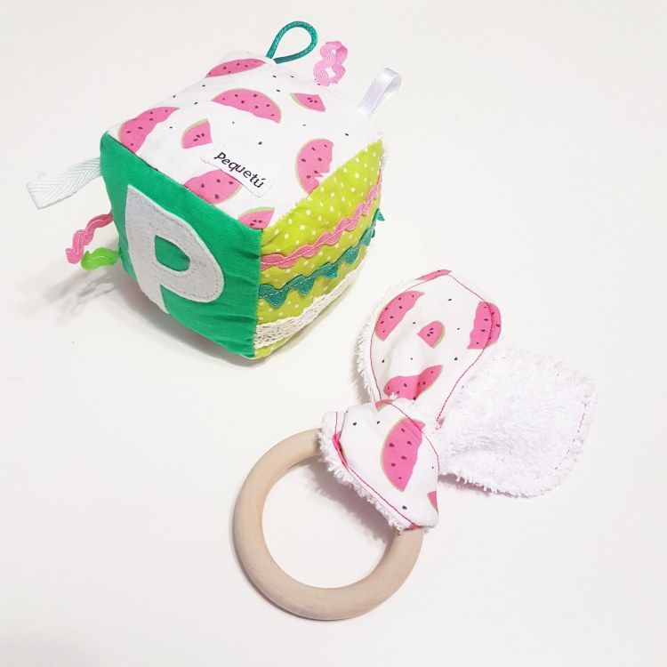Todos nuestros juguetes ayudan al desarrollo de los sentidos, el sonido mediante cascabeles o elementos sonoros, la vista con el color o estampados y el tacto con las diversas texturas o los lazos.
